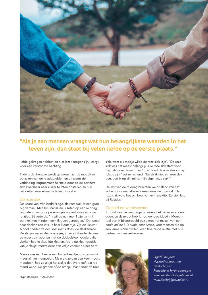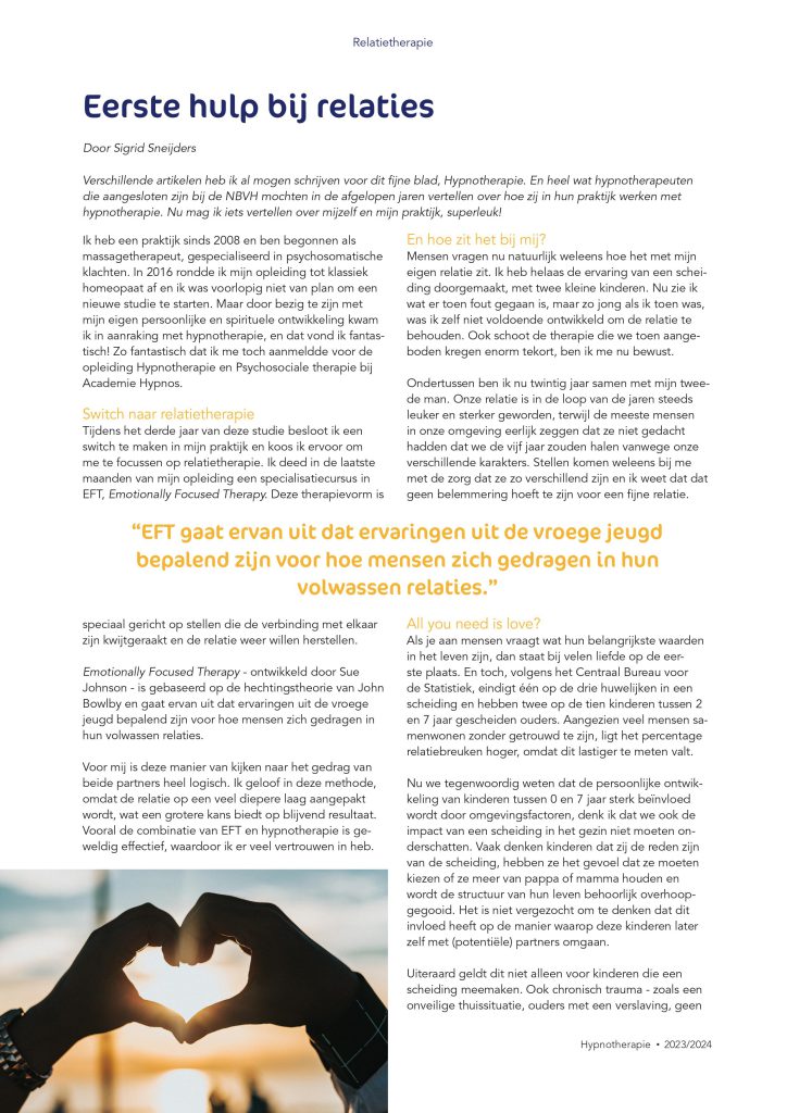 Verschillende artikelen heb ik al mogen schrijven voor dit fijne blad, Hypnotherapie. En heel wat hypnotherapeuten die aangesloten zijn bij de NBVH mochten in de afgelopen jaren vertellen over hoe zij in hun praktijk werken met hypnotherapie. En nu mocht Eerste Hulp bij Relaties in het vakblad!