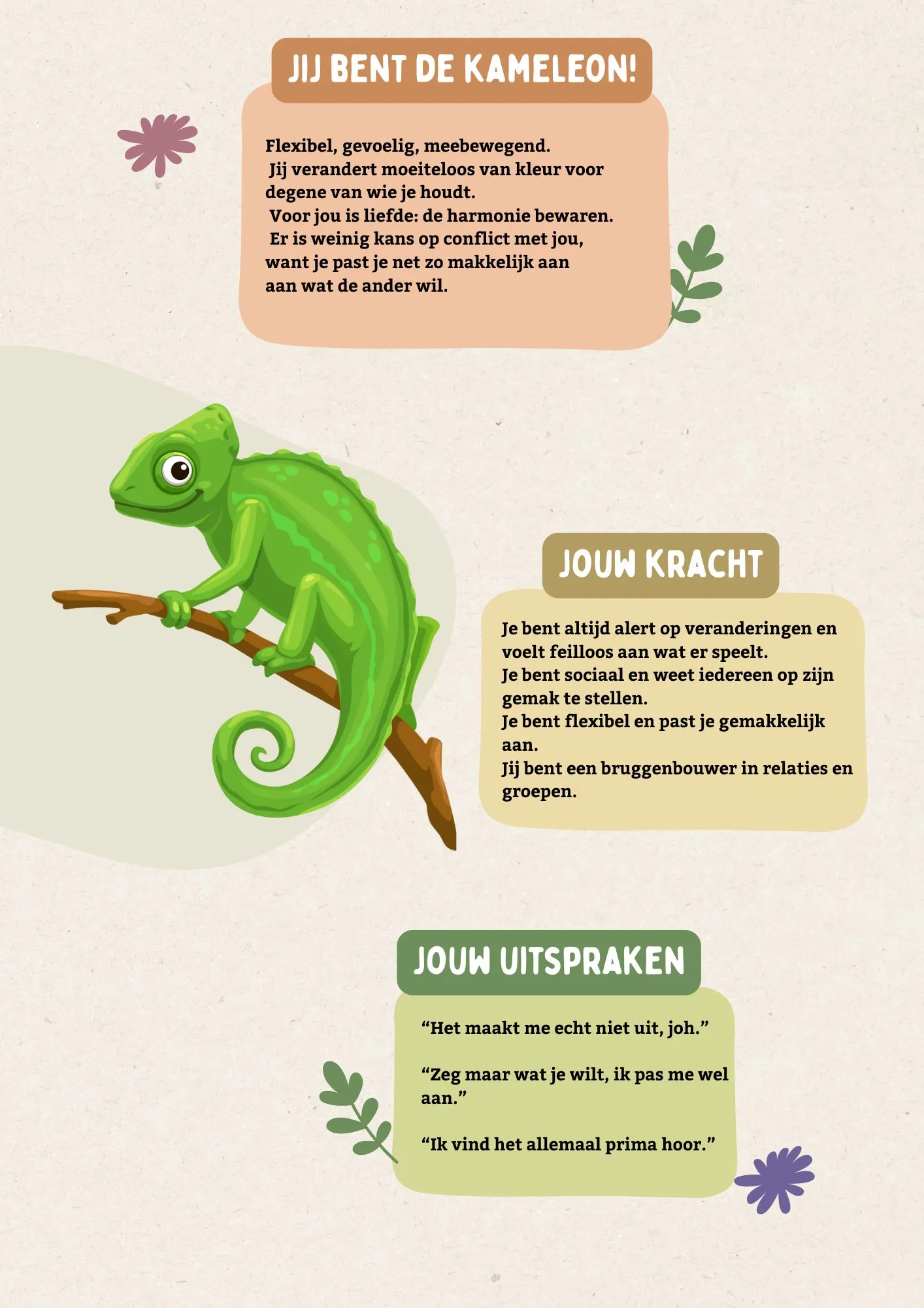 Als jij de Kameleon bent, herken je jezelf waarschijnlijk als iemand die zich makkelijk aanpast. Jij voelt feilloos aan wat er nodig is en beweegt daar moeiteloos in mee.